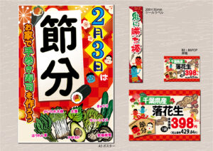 農産物はもちろん惣菜品など食品全般に添付のラベルやオリジナル商品のパッケージや食品スーパーのPOPやポスターなど多岐にわたる販促物の提案ができます。